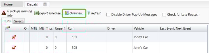 To reach the Dispatch Overview screen, open the Dispatch tab and click on the Overview Icon within the Dispatch Main Screen.
