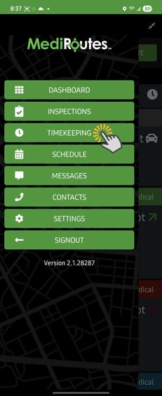 Drivers use the Timekeeping feature in the MediRoutes Mobile App to track their work hours, including shifts and breaks.