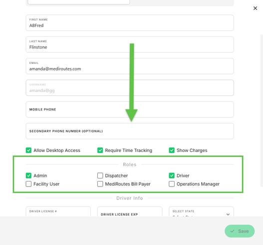 Learn how to locate and update user accounts in MediRoutes to manage roles, permissions, driver’s license details, and contact information.