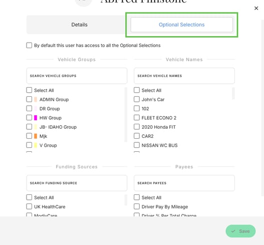 These selections help limit user visibility to only the relevant vehicles, funding sources, or other related system records.