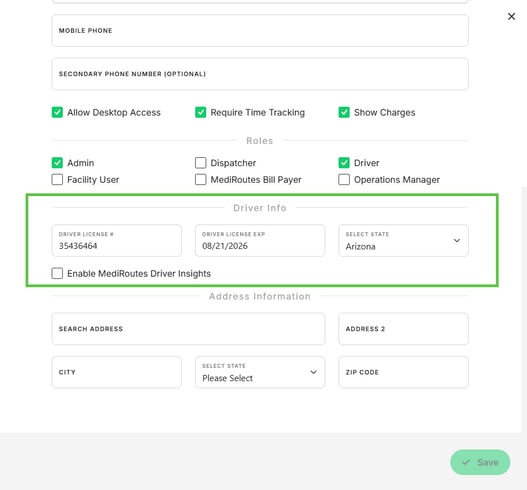 User accounts in MediRoutes store important information about system users, including their access permissions, driver’s license details, and contact information.