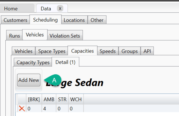 A - Click on Add New to define any additional configurations that would be required. Sometimes only one is needed. To add the values, double-click in each Space Type box and type in the number of passengers/seats. Review the information below to configure your capacity types.