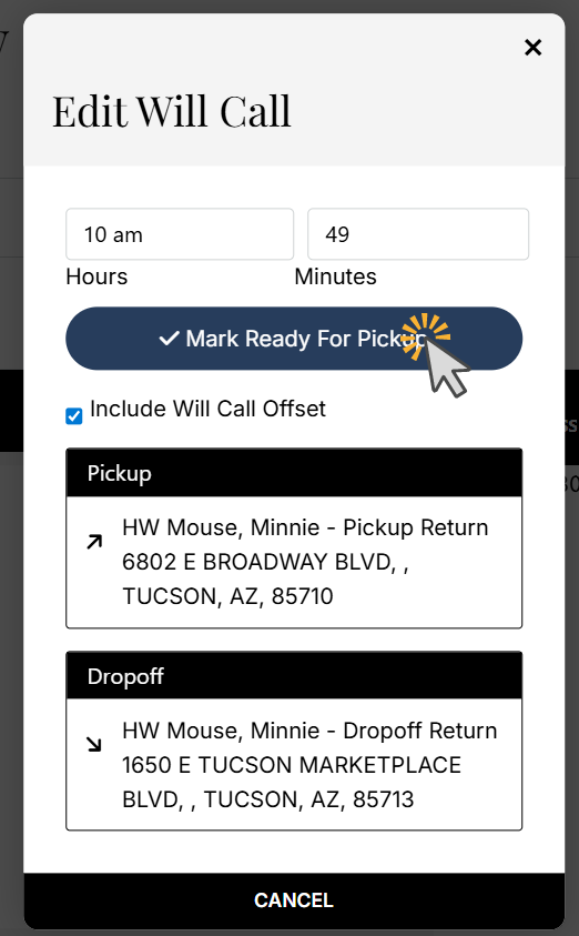 D - You manually edit the time the passenger will be ready by entering in the time in the boxes Hours and Minutes (it will default to the current time if the passenger is ready now). Click Mark Ready for pick up to activate the will call.