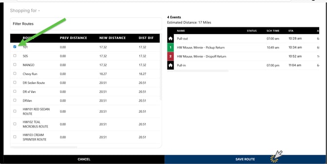When shopping or scheduling a trip, select the Run you want to assign the trip to, then click Save Route to add it to the selected Run.