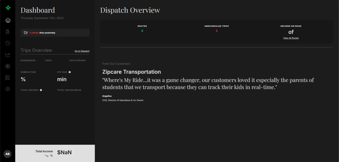 - Dashboard - A general area to see an overview of trip information for the day such as drivers out on the road and trip revenue.
