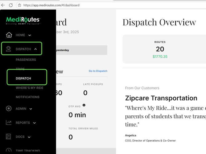 Open Dispatch in the MediRoutes.com(WebVersion)
