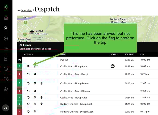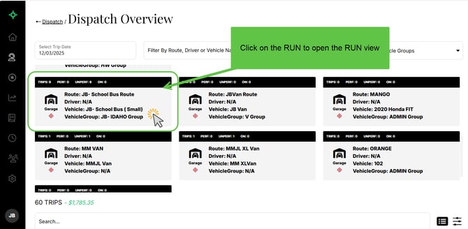 Navigate to the Dispatch tab to locate the trip that was marked performed by mistake. You will be able to see this in the RUN View.
