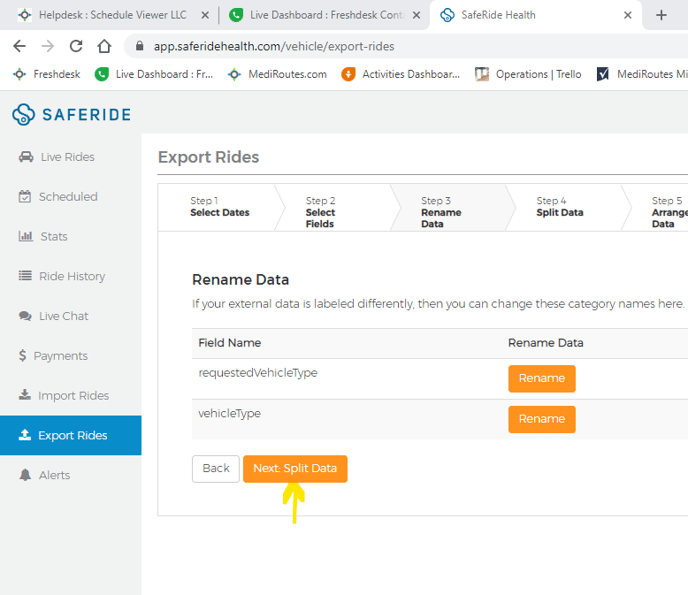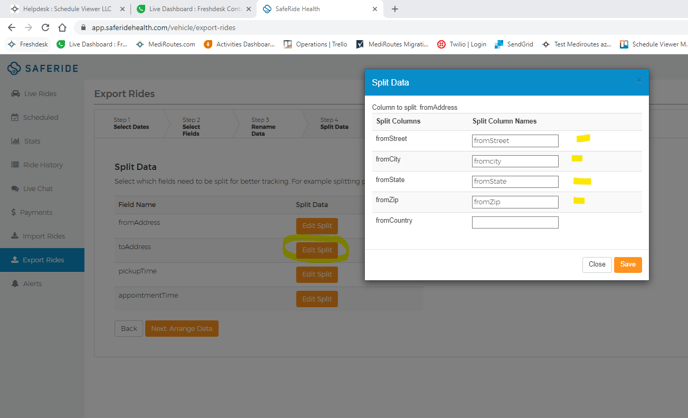 - Make sure to Split the address fields. See example screenshots below (Step 4 in Export Rides template creation). The Split Data step will give you the option to split the address, which must be done in order for the addresses to be accepted in MediRoutes. You Must name each column for the address split, to a different name or value so that is not the SAME as any other column name. All columns MUST be a different name/value as any other column.