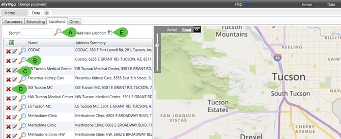 The magnifying glass icon to the left of an address(B) will show you that address on the map to the right, while the edit button (C) will allow you to edit the details of a Common Location. The red X(D) will allow you to delete a Common Location from the list.