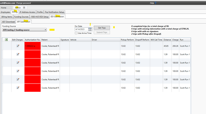 - Billing is done on API submission tab. Go to Admin, Billing, EDI Submission, API submission tabs, choose Funding source, date, and click Get Trip.