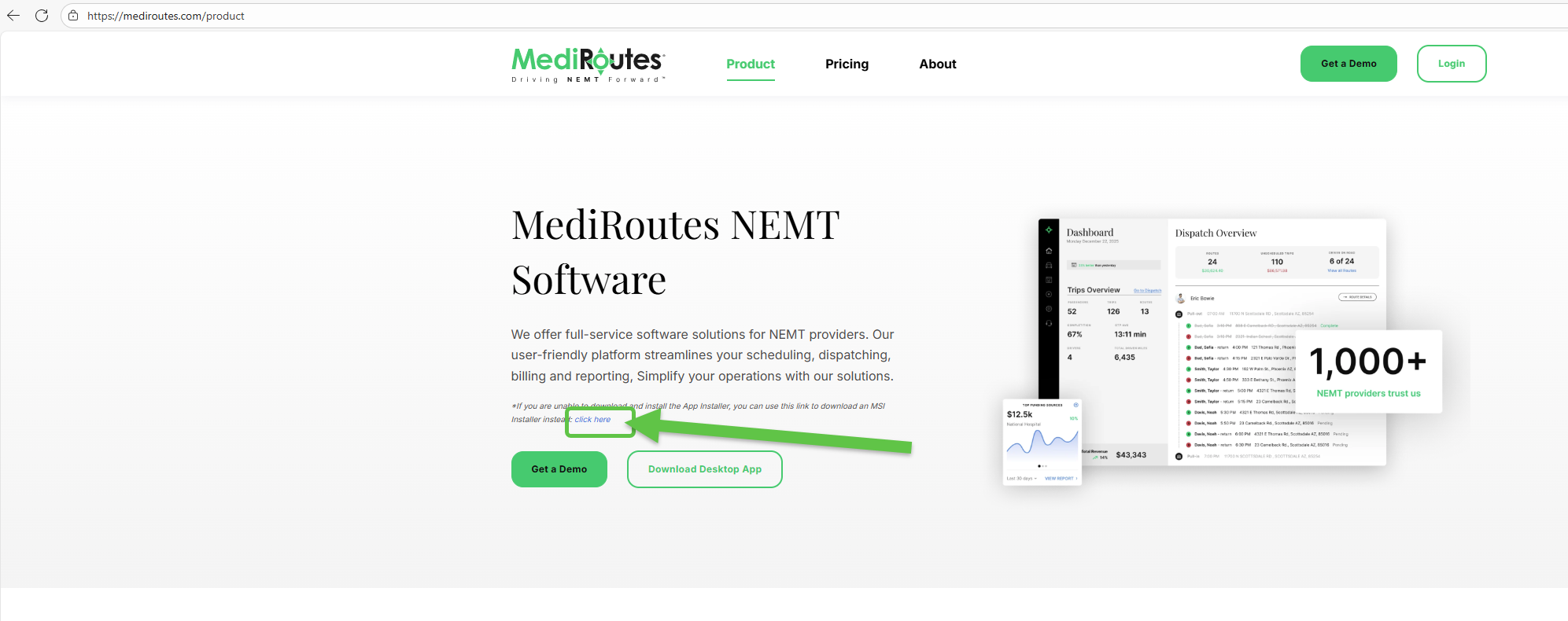To download the MSI installer, go to the product page on MediRoutes.com and click the link for the MSI Installer. https://mediroutes.com/product