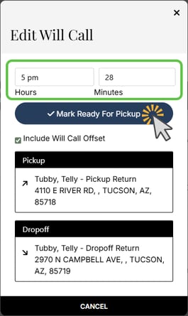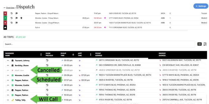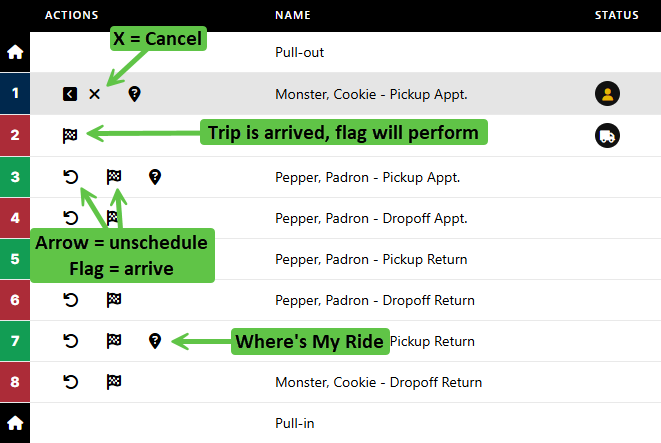 The cancel option here will mark the trip as a no show/dry run. To mark a trip as an advanced cancel, first unschedule it, then locate it in your trip list. Open the trip options (three dots) and select the green X button.