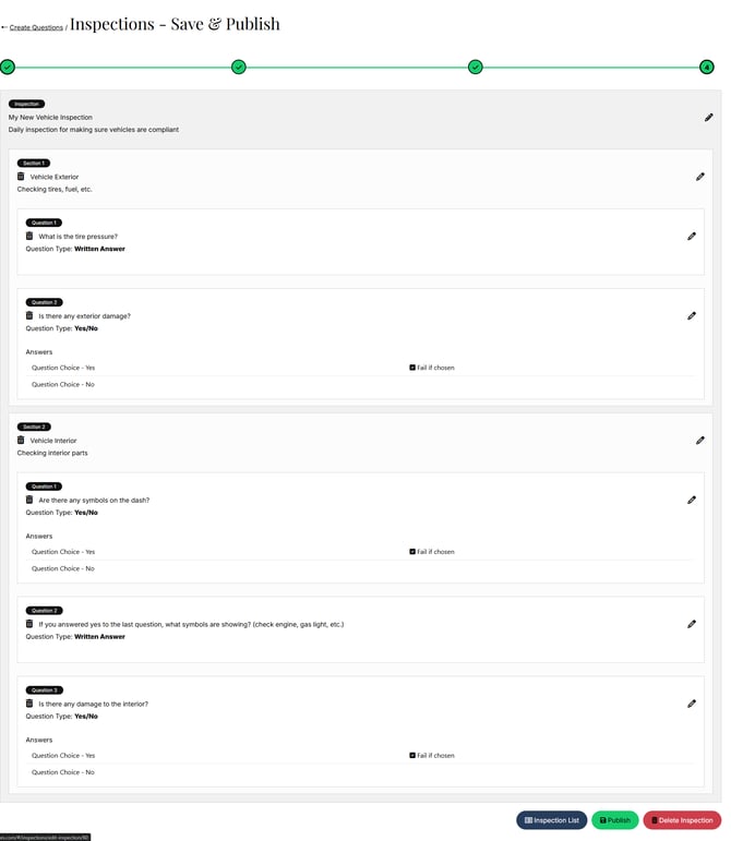 - You can return later to edit the inspection if needed or edit it before publishing using the pencil buttons on the right