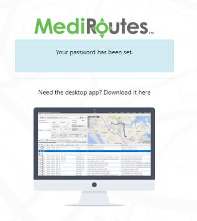 Once you have Verified your email and set a new password, you will see a confirmation page that will link to the MediRoutes Mobile App for a driver only account or will link to the MediRoutes Desktop App for a desktop account.
