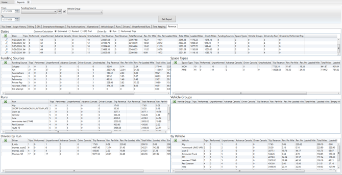 - Funding Source – shows trip data grouped by the Funding Source attached to each trip, so you can analyze volume, mileage, and revenue by payer or program.