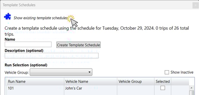 To delete an existing template, navigate back to the Template Schedules window from the main Schedules tab (shown in Step 4). Click Show existing template schedules.