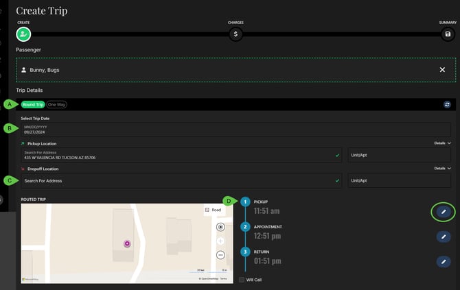 - Edit the Pickup time, Appointment time, and Return time to the right of the map by clicking the blue pencil button, then click the green checkmark to confirm (D). There is also a Will Call checkbox below the Return time if the Return Time is not known.