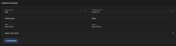 - Additional Details: Here you can change the Space Type and Funding Source if needed. You can also add an Authorization number, trip "Other" fields, or additional passengers (optional).