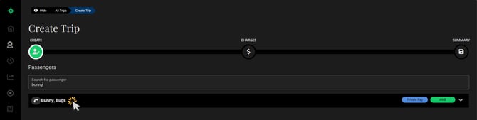 - Search for the passenger you want to create the trip for. Click on the passenger's name to select them.