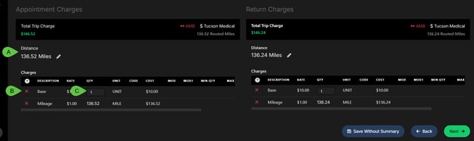 - Charges: If you hit Next on the previous step, you will proceed to the charges page, where you can review the distance and rates on the trip. There will be two boxes here if you are creating a round trip, one box for each trip leg.