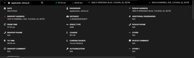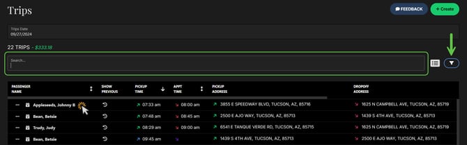 - In the search Box, type in the passenger's name for the trip you want to edit. You also have filter options with the Funnel on the right for a more refined search. Click on the name of the passenger to see full trip details.