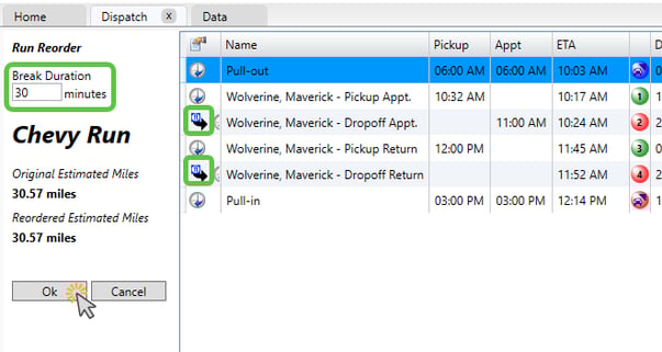 The Run Reorder screen will appear with available time slots.