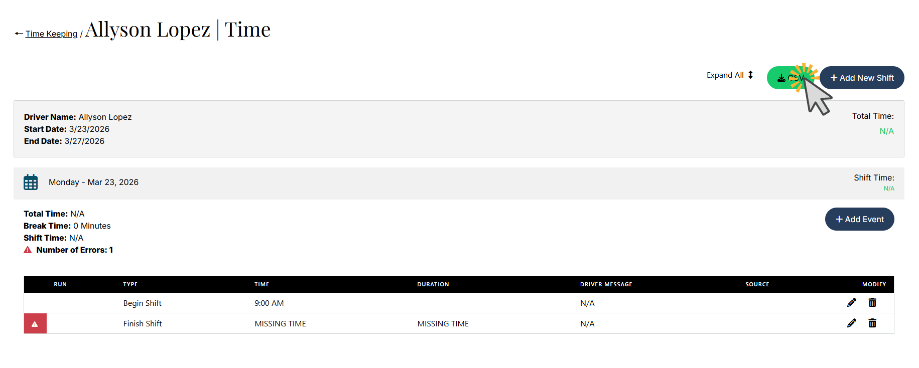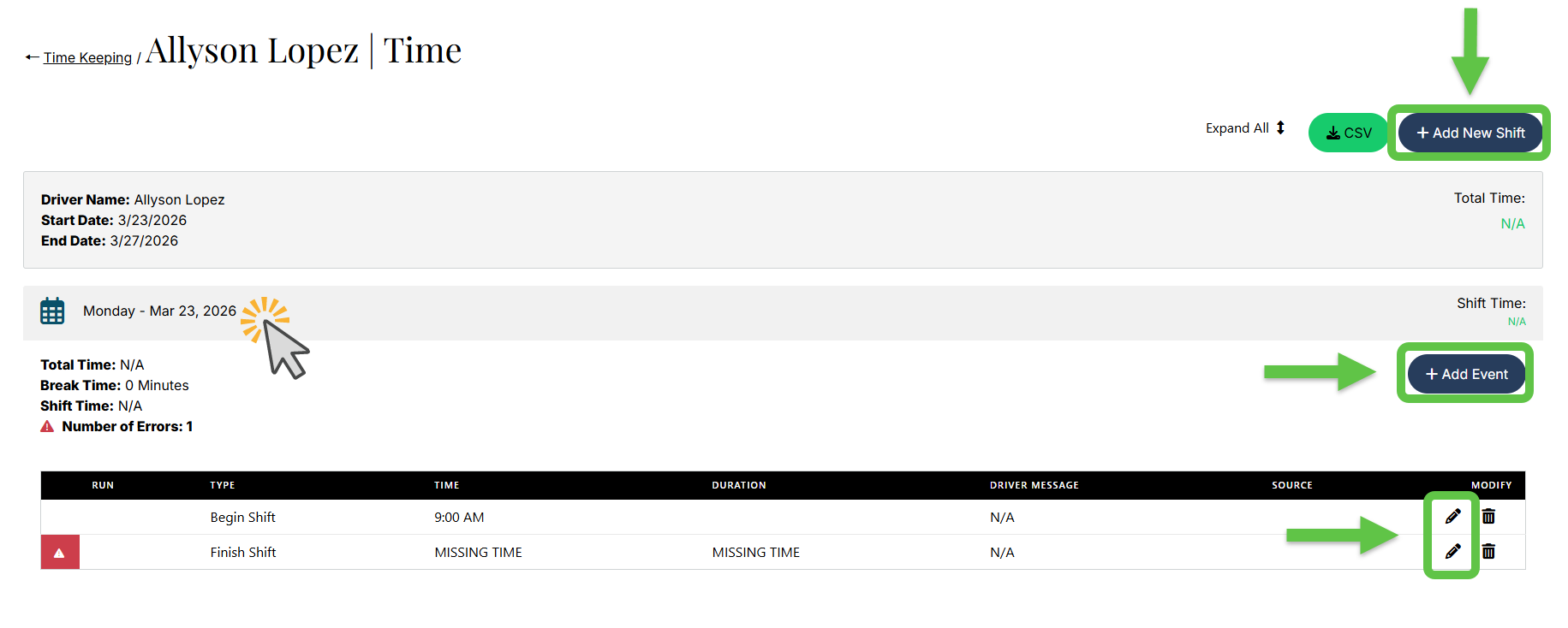 - Add missing timekeeping events or missing shifts (also on View Details page)