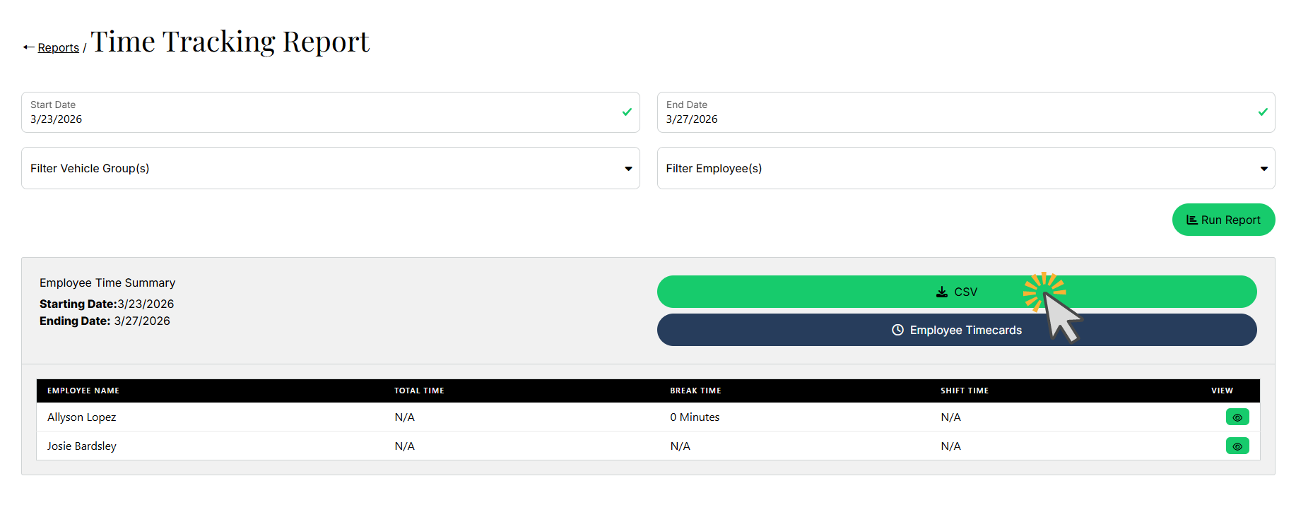 - Click Employee Timecards to view times for all employees